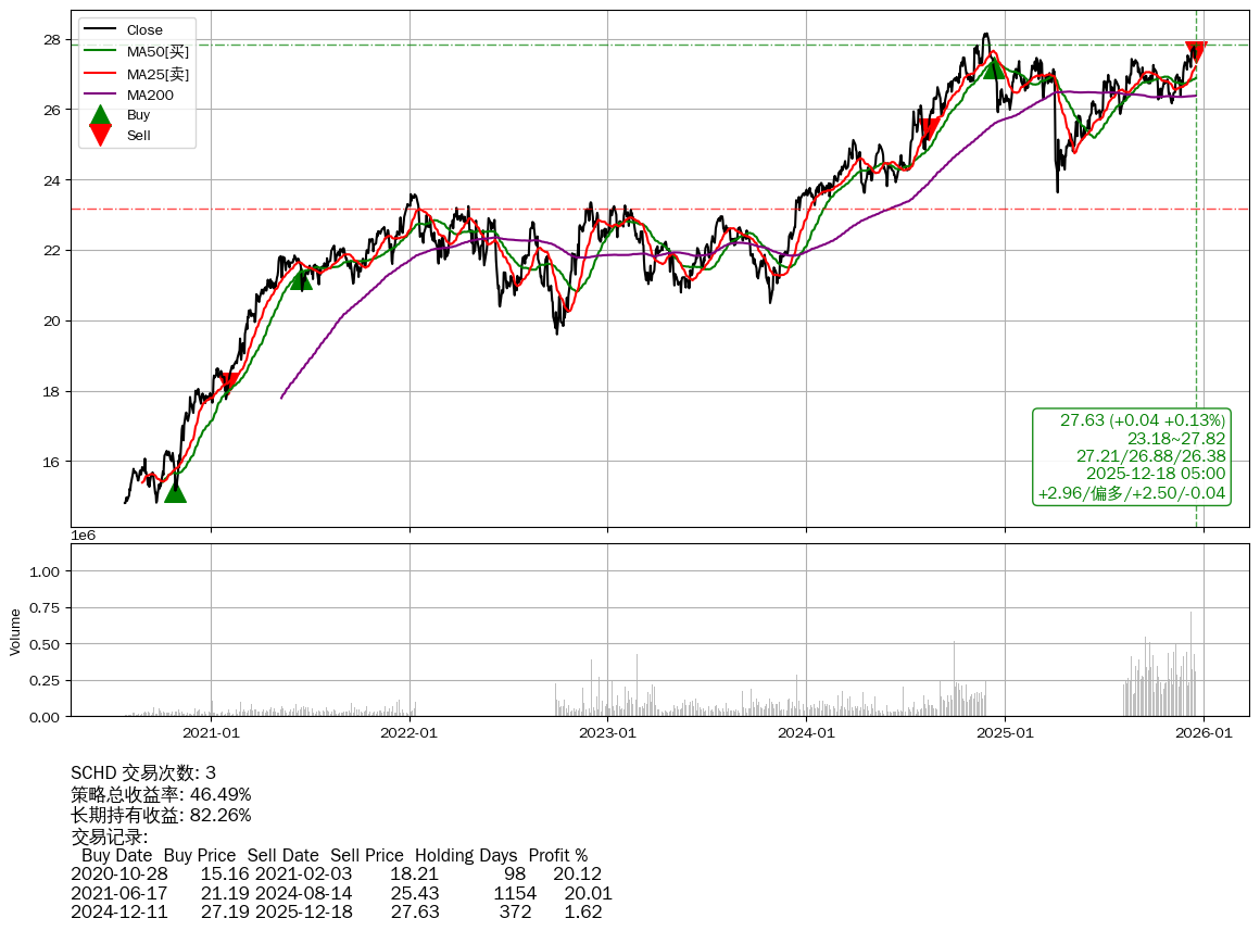 | 32 | ★SCHD | $27.48(-0.12 -0.43%) 12-18 14:59 27.59 12-17 | 📈涨破 MA5 均线 📉回撤 2024-12-01 -1.85% (381天) 28.15(2024-11-28)→23.63(04-07) | +46.49% | +82.26% | -35.76% | 3 | 偏多/2.5/-0.04 | 2020-07-27~2025-12-18 |