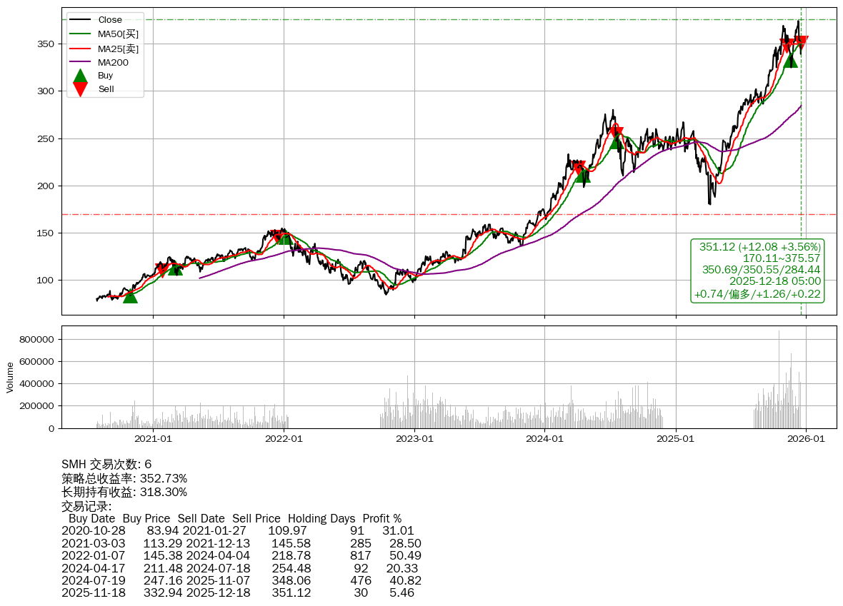| 5 | ★SMH | $347.58(+8.61 +2.54%) 12-18 14:59 338.97 12-17 | 📈涨破 MA5/25/50 均线 📉回撤 12-10 -6.16% (7天) 374.18(12-09)→339.04(12-16) | +352.73% | +318.30% | +34.43% | 6 | 偏多/1.26/0.22 | 2020-07-27~2025-12-18 |