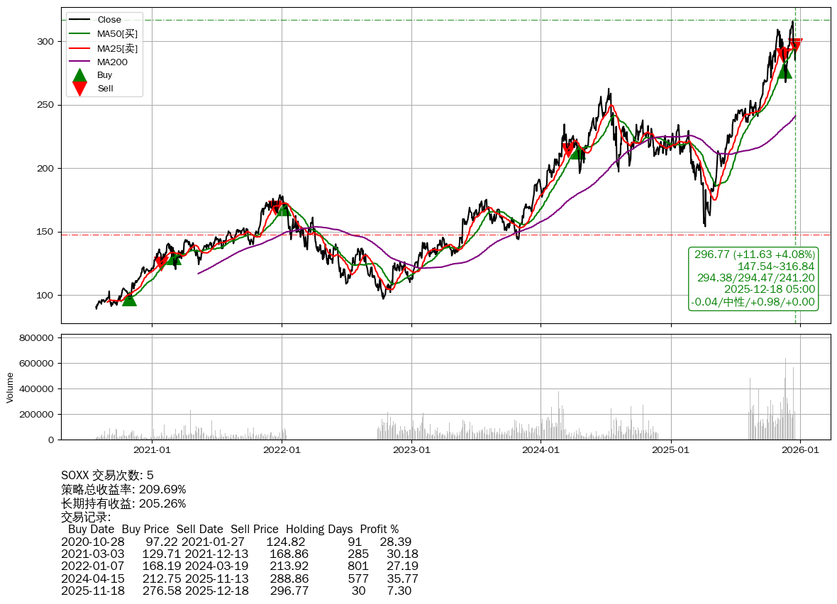 | 11 | ★SOXX | $292.04(+6.93 +2.43%) 12-18 14:59 285.11 12-17 | 📈涨破 MA5/25/50 均线 📉回撤 12-10 -6.01% (7天) 315.75(12-09)→285.14(12-16) | +209.69% | +205.26% | +4.44% | 5 | 中性/0.98/0.00 | 2020-07-27~2025-12-18 |