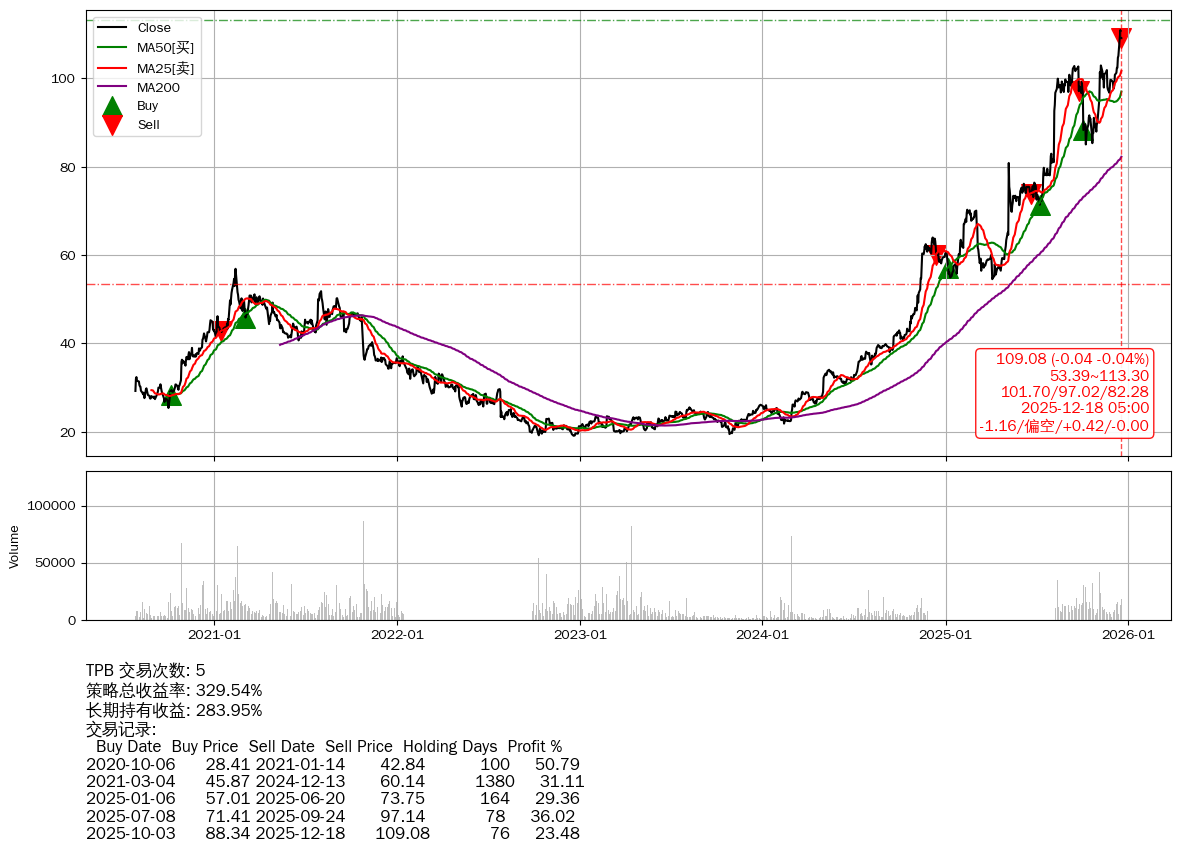 | 6 | TPB | $108.94(-0.25 -0.23%) 12-18 14:59 109.19 12-17 | 📉回撤 12-16 -1.70% (1天) 110.97(12-15)→109.08(12-17) | +329.54% | +283.95% | +45.59% | 5 | 偏空/0.42/-0.00 | 2020-07-27~2025-12-18 |