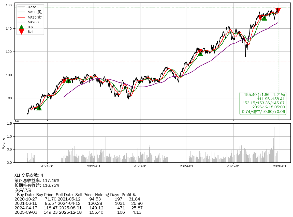 | 25 | ★XLI | $154.48(+0.96 +0.63%) 12-18 14:59 153.52 12-17 | 📉回撤 12-11 -1.49% (6天) 157.74(12-10)→153.54(12-16) | +117.49% | +116.73% | +0.76% | 4 | 偏空/0.6/0.06 | 2020-07-27~2025-12-18 |