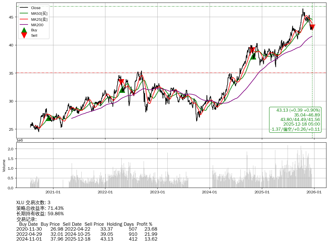 | 29 | ★XLU | $43.19(+0.44 +1.03%) 12-18 14:59 42.75 12-17 | 📈涨破 MA5/10 均线 📉回撤 10-15 -7.13% (63天) 46.44(10-14)→42.72(12-09) | +71.43% | +59.86% | +11.57% | 3 | 偏空/0.26/0.11 | 2020-07-27~2025-12-18 |
