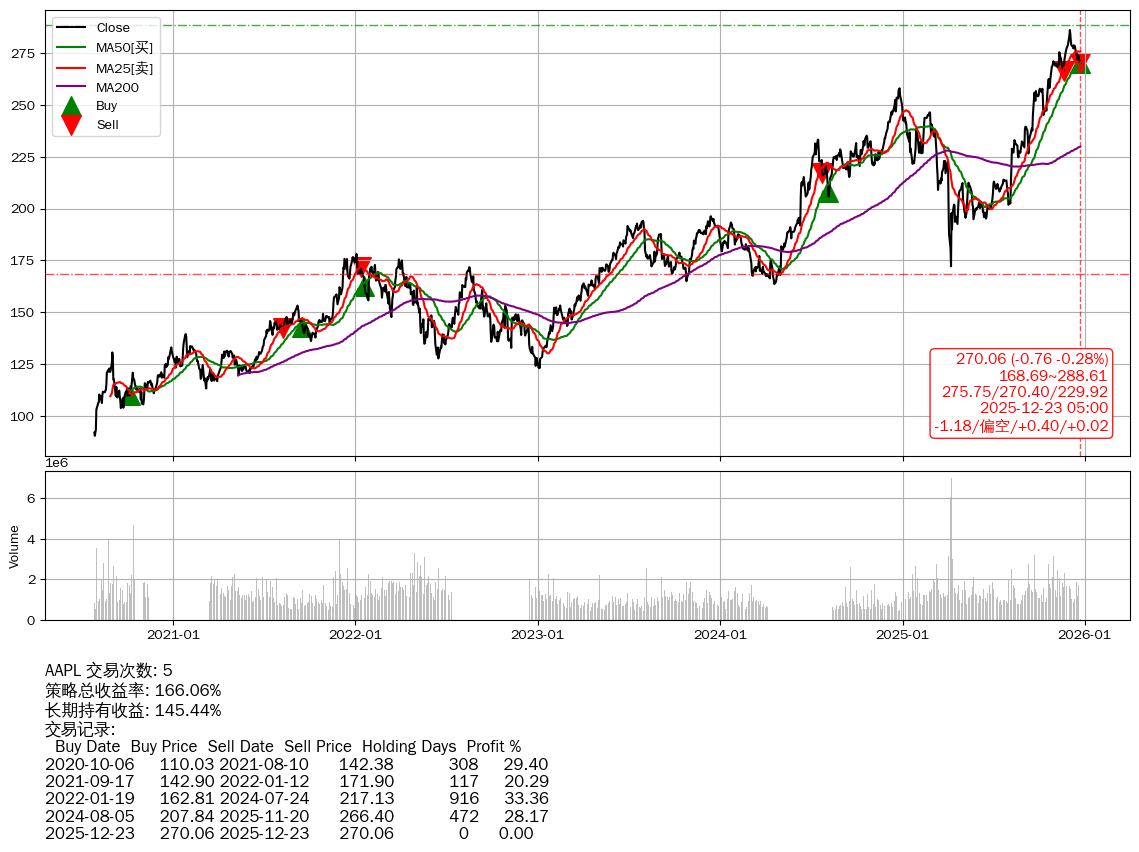 | 17 | ★AAPL | $272.24(+1.42 +0.52%) 12-23 14:59 270.82 12-22 | 📉跌破 MA50 均线 📉回撤 12-02 -5.60% (20天) 286.09(12-01)→270.06(12-22) | +166.06% | +145.44% | +20.62% | 5 | 偏空/0.4/0.02 | 2020-07-27~2025-12-23 |