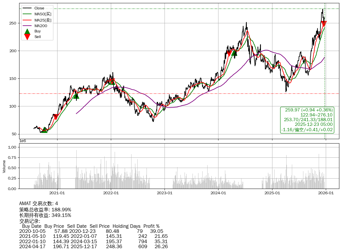| 13 | ★AMAT | $260.22(+1.07 +0.41%) 12-23 14:59 259.15 12-22 | 📉回撤 12-10 -5.49% (12天) 275.08(12-09)→248.36(12-16) | +188.99% | +349.15% | -160.17% | 4 | 偏空/0.42/0.02 | 2020-07-27~2025-12-23 |