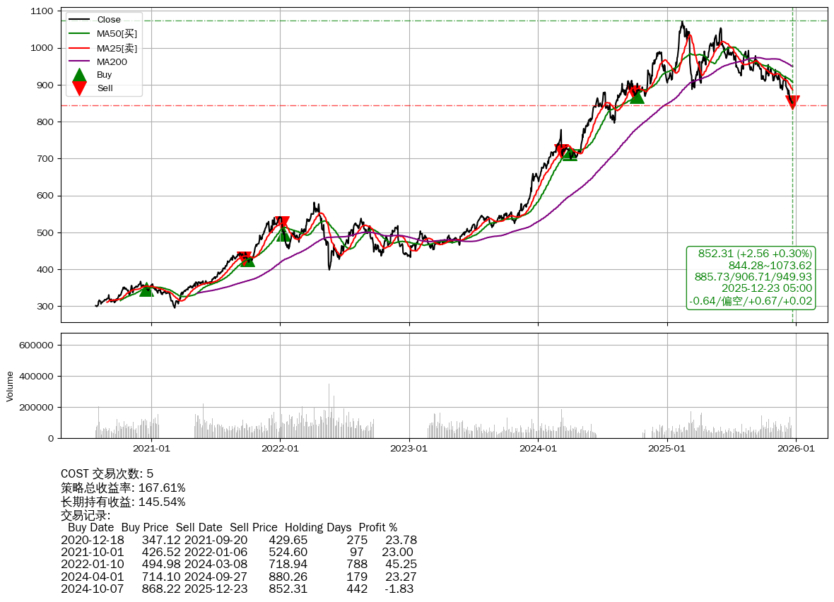 | 16 | ★COST | $854.72(+5.08 +0.60%) 12-23 14:59 849.64 12-22 | 📉回撤 02-13 -20.48% (312天) 1071.88(02-12)→849.75(12-21) | +167.61% | +145.54% | +22.08% | 5 | 偏空/0.67/0.02 | 2020-07-27~2025-12-23 |