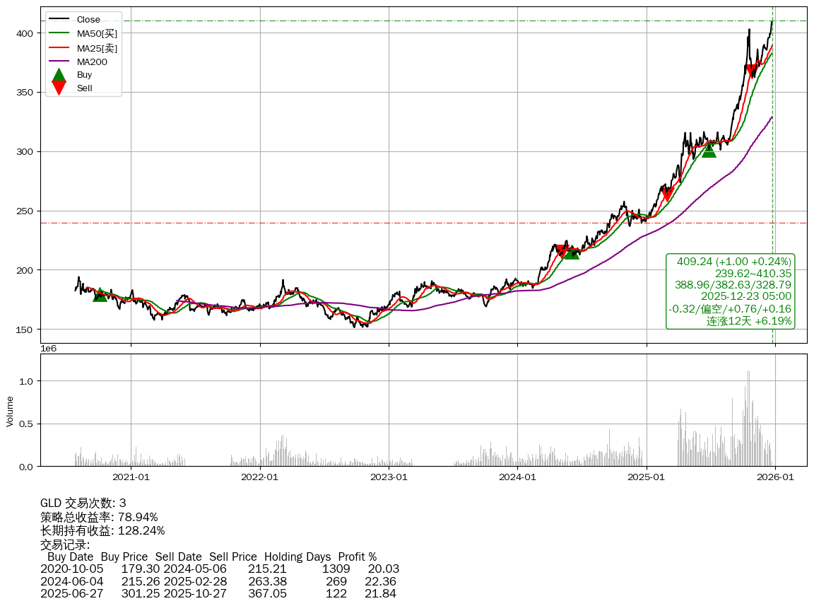 | 28 | ★GLD | $413.56(+5.31 +1.30%) 12-23 14:59 408.25 12-22 | 📈涨破 52周高点 (410.35) 📈连涨12天 +6.19% | +78.94% | +128.24% | -49.30% | 3 | 偏空/0.76/0.16 | 2020-07-27~2025-12-23 |