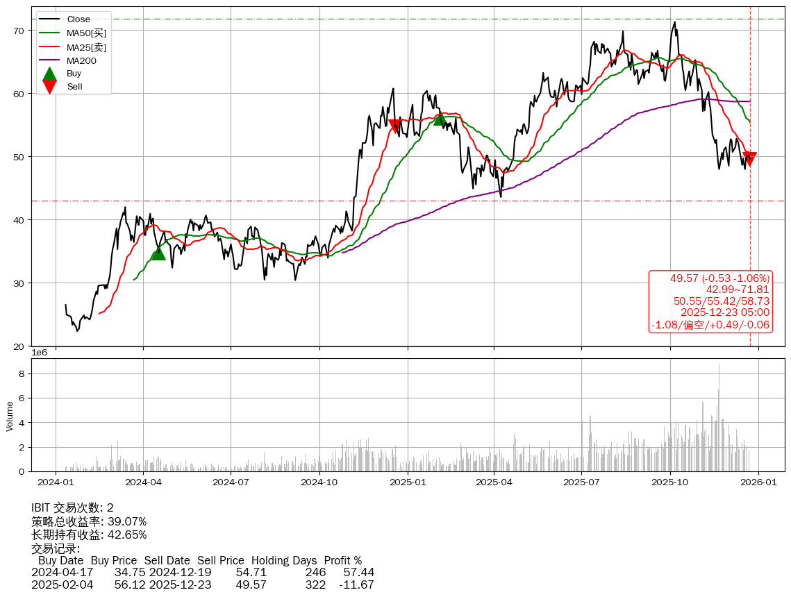 | 36 | ★IBIT | $49.69(-0.40 -0.80%) 12-23 14:59 50.09 12-22 | 📉跌破 MA10 均线 📉回撤 10-06 -30.47% (77天) 71.29(10-05)→47.98(11-20) | +39.07% | +42.65% | -3.58% | 2 | 偏空/0.49/-0.06 | 2024-01-11~2025-12-23 |