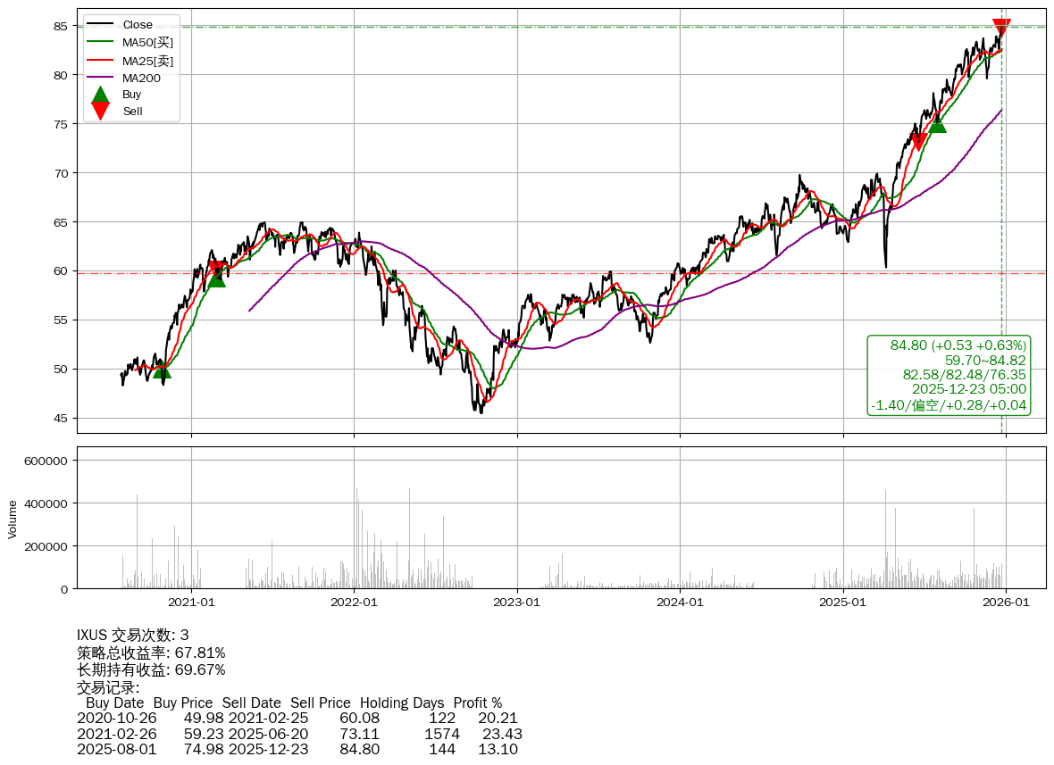 | 31 | 🟢IXUS | $84.80(+0.54 +0.64%) 12-23 14:59 84.26 12-22 | 📈涨破 52周高点 (84.82) | +67.81% | +69.67% | -1.86% | 3 | 偏空/0.28/0.04 | 2020-07-27~2025-12-23 |