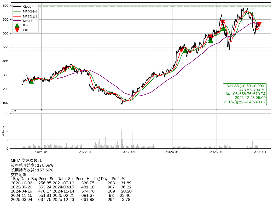 | 14 | ★META | $664.70(+3.40 +0.51%) 12-23 14:59 661.30 12-22 | 📉回撤 08-12 -16.07% (132天) 788.62(08-11)→588.67(11-19) | +176.69% | +157.69% | +19.00% | 5 | 偏空/0.4/0.02 | 2020-07-27~2025-12-23 |