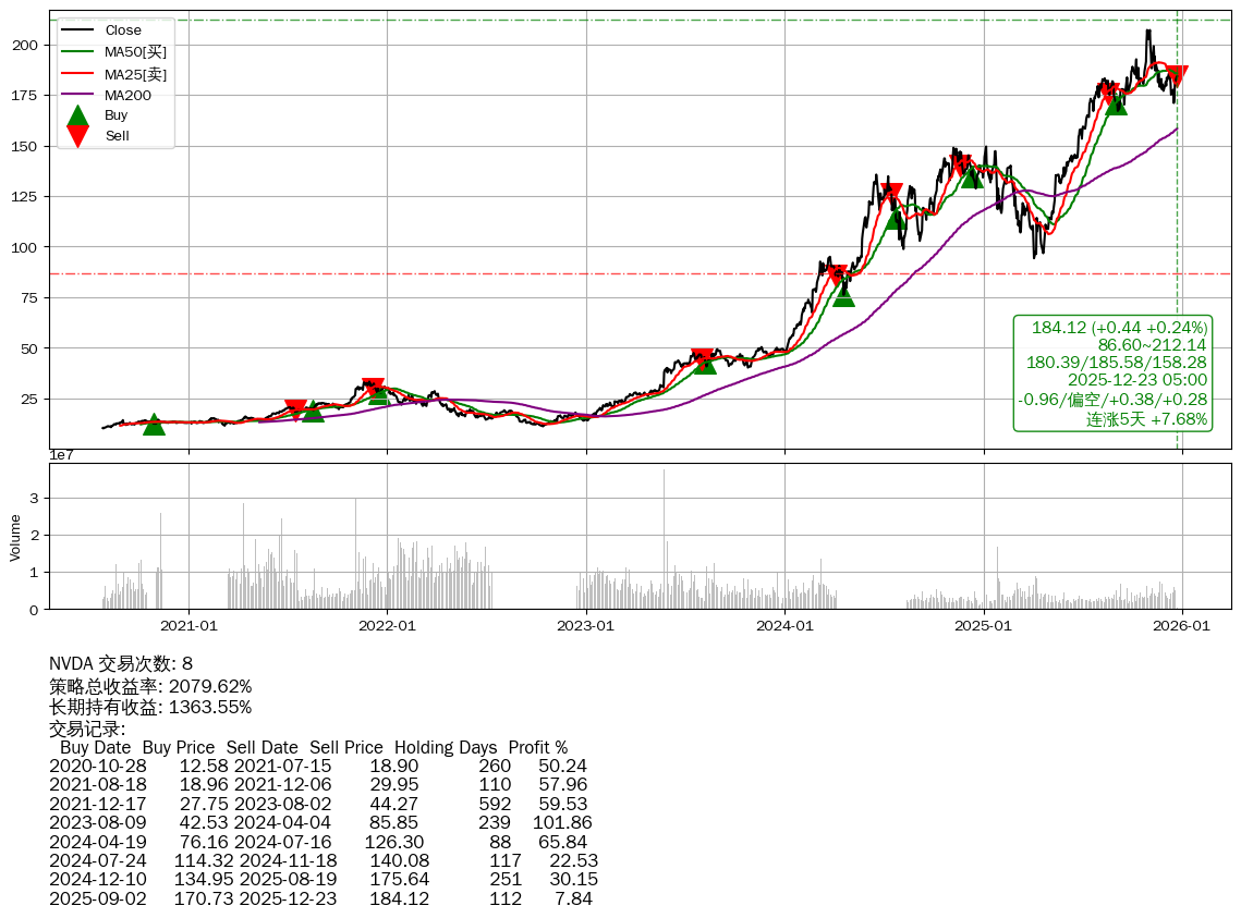 | 1 | ★NVDA | $189.21(+5.60 +3.05%) 12-23 14:59 183.61 12-22 | 📈连涨5天 +7.68% 📉回撤 10-29 -11.06% (54天) 207.02(10-28)→170.98(12-16) | +2079.62% | +1363.55% | +716.07% | 8 | 偏空/0.38/0.28 | 2020-07-27~2025-12-23 |