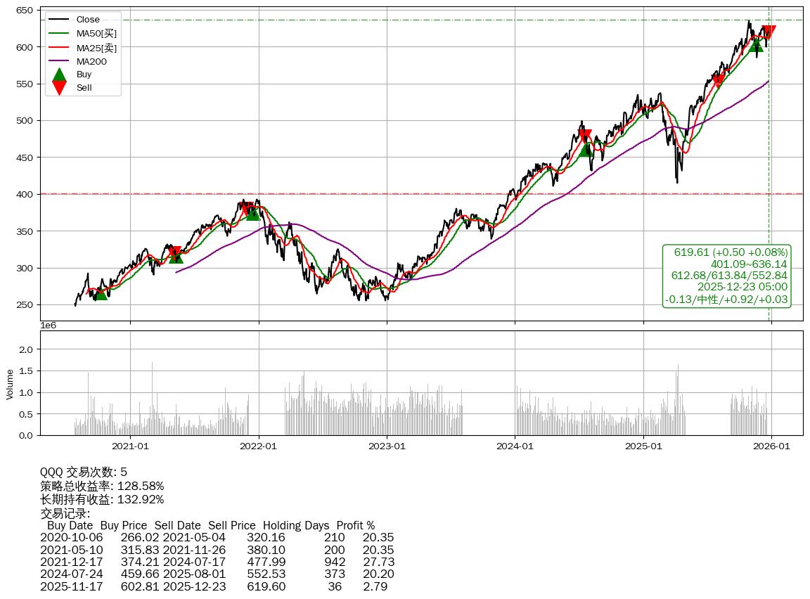 | 21 | ★QQQ | $622.21(+3.06 +0.49%) 12-23 14:59 619.15 12-22 | 📉回撤 10-29 -2.43% (54天) 635.06(10-28)→585.07(11-19) | +128.58% | +132.92% | -4.34% | 5 | 中性/0.92/0.03 | 2020-07-27~2025-12-23 |