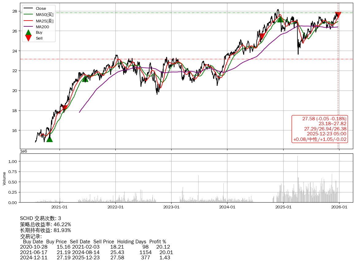 | 34 | ★SCHD | $27.54(-0.08 -0.29%) 12-23 14:59 27.62 12-22 | 📉跌破 MA10 均线 📉回撤 2024-12-01 -2.02% (386天) 28.15(2024-11-28)→23.63(04-07) | +46.22% | +81.93% | -35.71% | 3 | 中性/1.05/-0.02 | 2020-07-27~2025-12-23 |