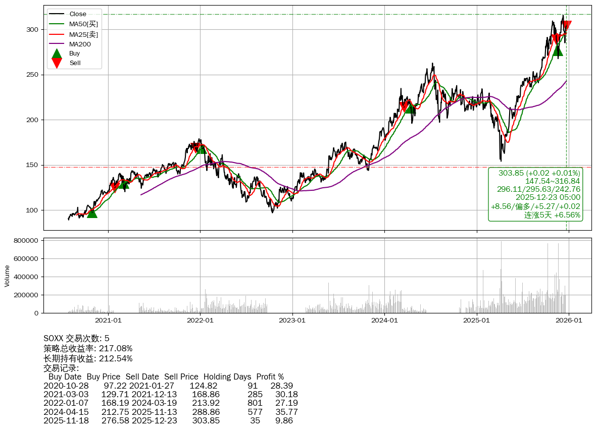 | 11 | ★SOXX | $304.94(+1.13 +0.37%) 12-23 14:59 303.81 12-22 | 📈连涨5天 +6.56% 📉回撤 12-10 -3.77% (12天) 315.75(12-09)→285.14(12-16) | +217.08% | +212.54% | +4.54% | 5 | 偏多/5.27/0.02 | 2020-07-27~2025-12-23 |