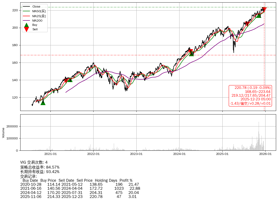 | 27 | ★VIG | $221.25(+0.32 +0.14%) 12-23 14:59 220.93 12-22 | 📉回撤 12-11 -1.21% (11天) 223.48(12-10)→218.15(12-16) | +84.57% | +93.42% | -8.86% | 4 | 偏空/0.28/0.01 | 2020-07-27~2025-12-23 |