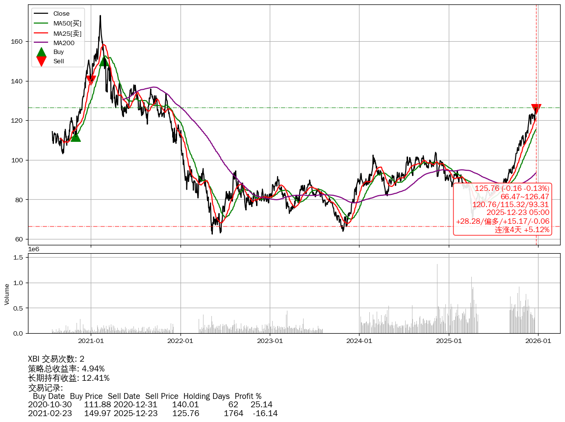 | 38 | ★XBI | $124.91(-1.00 -0.79%) 12-23 14:59 125.92 12-22 | 📈连涨4天 +5.12% 📉回撤 2021-02-08 -27.32% (1778天) 173.03(2021-02-07)→62.39(2022-05-10) | +4.94% | +12.41% | -7.46% | 2 | 偏多/15.57/-0.06 | 2020-07-27~2025-12-23 |