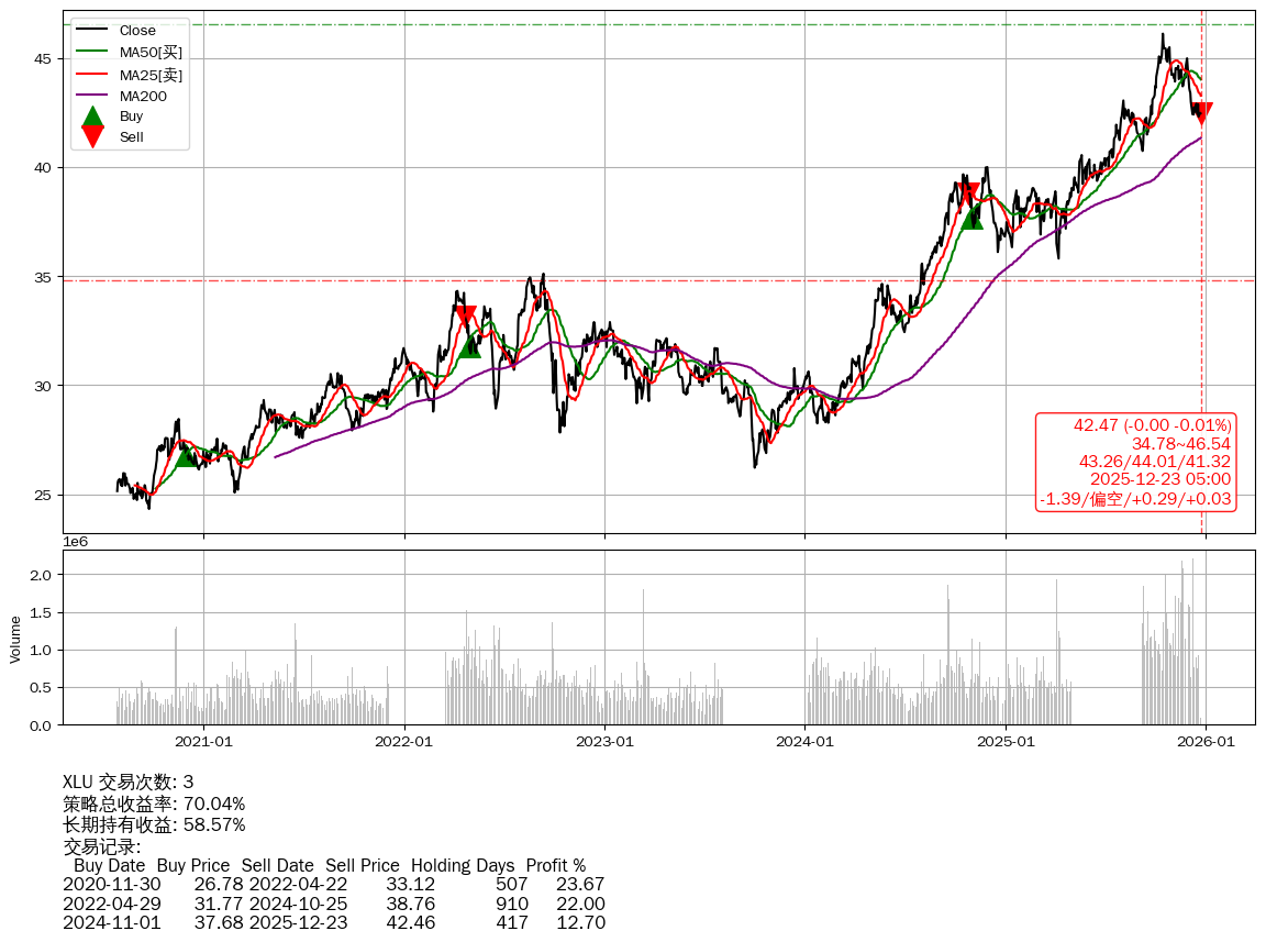 | 29 | ★XLU | $42.60(+0.13 +0.31%) 12-23 14:59 42.47 12-22 | 📉回撤 10-15 -7.89% (68天) 46.10(10-14)→42.30(12-18) | +70.04% | +58.57% | +11.47% | 3 | 偏空/0.29/0.03 | 2020-07-27~2025-12-23 |