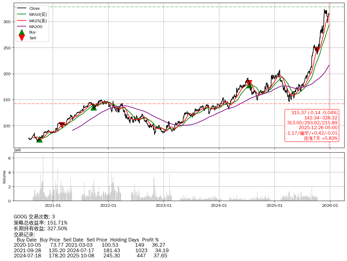 | 22 | ★GOOG | $314.96(-0.72 -0.23%) 12-26 14:59 315.68 12-24 | 📈连涨7天 +5.83% 📉回撤 11-25 -2.50% (30天) 323.47(11-24)→298.01(12-16) | +151.71% | +327.50% | -175.80% | 3 | 偏空/0.42/-0.01 | 2020-07-27~2025-12-26 |