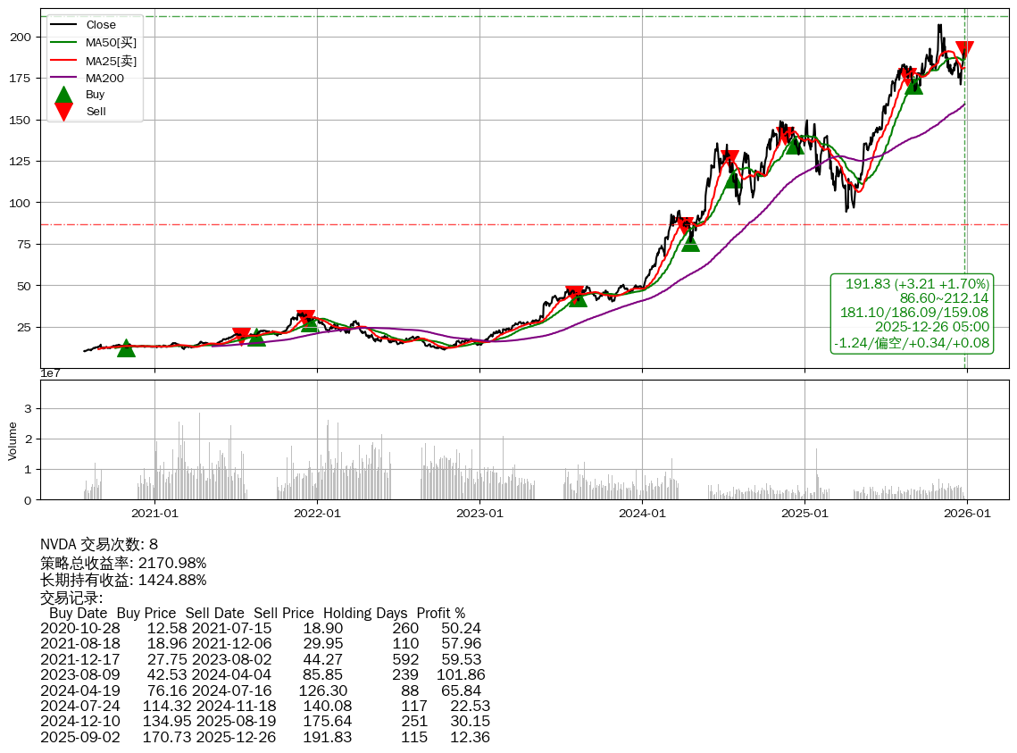 | 1 | ★NVDA | $190.54(+1.92 +1.02%) 12-26 14:59 188.62 12-24 | 📉回撤 10-29 -7.34% (57天) 207.02(10-28)→170.98(12-16) | +2170.98% | +1424.88% | +746.10% | 8 | 偏空/0.34/0.08 | 2020-07-27~2025-12-26 |