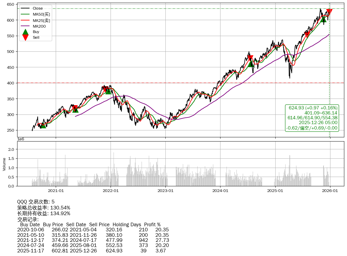 | 23 | ★QQQ | $623.84(-0.10 -0.02%) 12-26 14:59 623.94 12-24 | 📉回撤 10-29 -1.60% (57天) 635.06(10-28)→585.07(11-19) | +130.54% | +134.92% | -4.38% | 5 | 偏空/0.69/-0.00 | 2020-07-27~2025-12-26 |