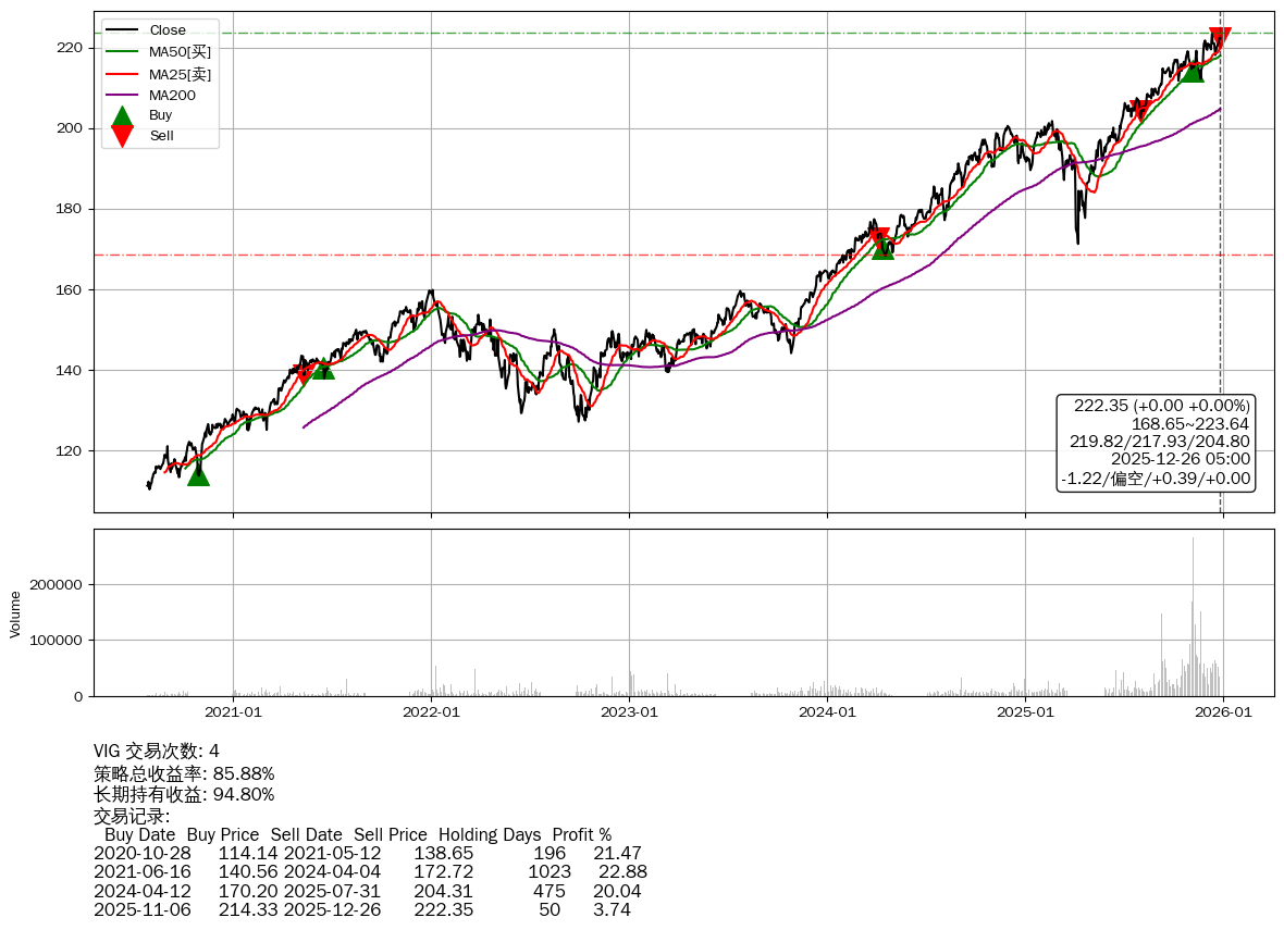 | 29 | ★VIG | $222.49(-0.02 -0.01%) 12-26 14:59 222.51 12-24 | 📉回撤 12-11 -0.51% (14天) 223.48(12-10)→218.15(12-16) | +85.88% | +94.80% | -8.93% | 4 | 偏空/0.39/0.00 | 2020-07-27~2025-12-26 |