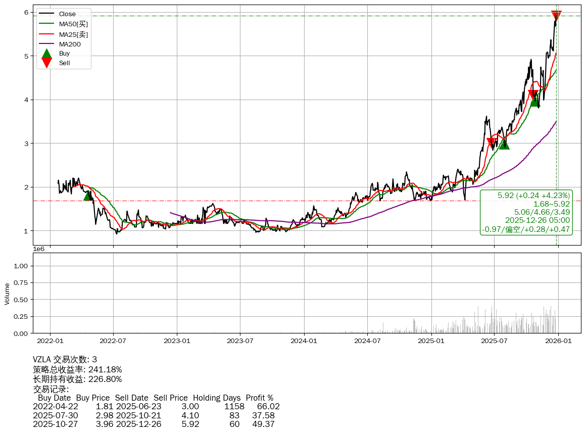 | 12 | 🟢VZLA | $5.91(+0.28 +4.96%) 12-26 14:59 5.64 12-24 | 📈涨破 MA5 均线 📈涨破 52周高点 (5.92) | +241.18% | +226.80% | +14.38% | 3 | 偏空/0.28/0.47 | 2022-01-24~2025-12-26 |