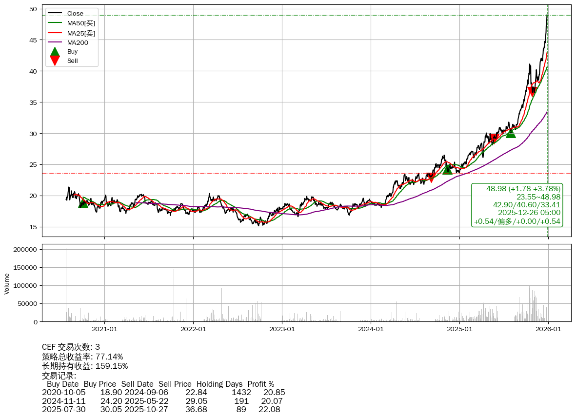 | 31 | CEF | $48.98(+1.73 +3.66%) 12-26 14:59 47.25 12-24 | 📈涨破 52周高点 (48.98) | +77.14% | +159.15% | -82.01% | 3 | 偏多/0/0.54 | 2020-07-27~2025-12-26 |