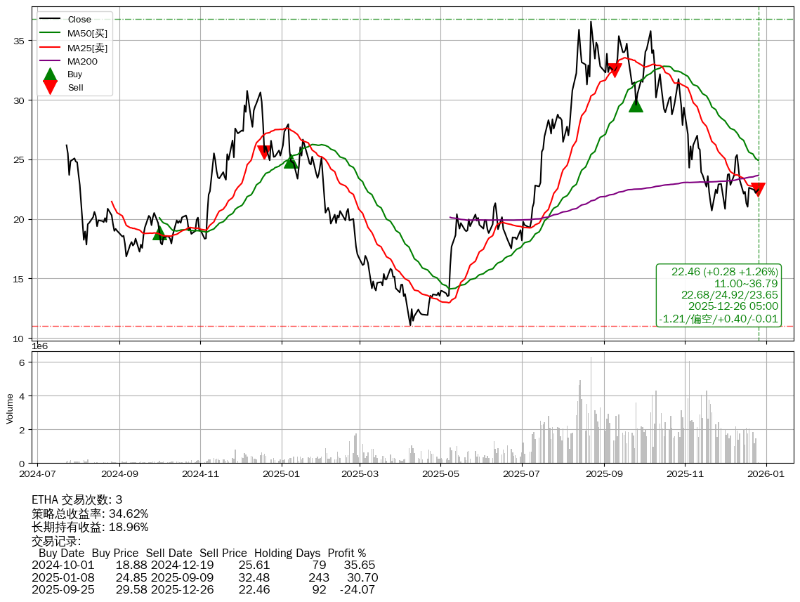 | 39 | ★ETHA | $22.14(-0.03 -0.14%) 12-26 14:59 22.17 12-24 | 📈涨破 MA5/10 均线 📉回撤 08-24 -38.60% (123天) 36.58(08-21)→20.70(11-20) | +34.62% | +18.96% | +15.66% | 3 | 偏空/0.4/-0.01 | 2024-07-23~2025-12-26 |