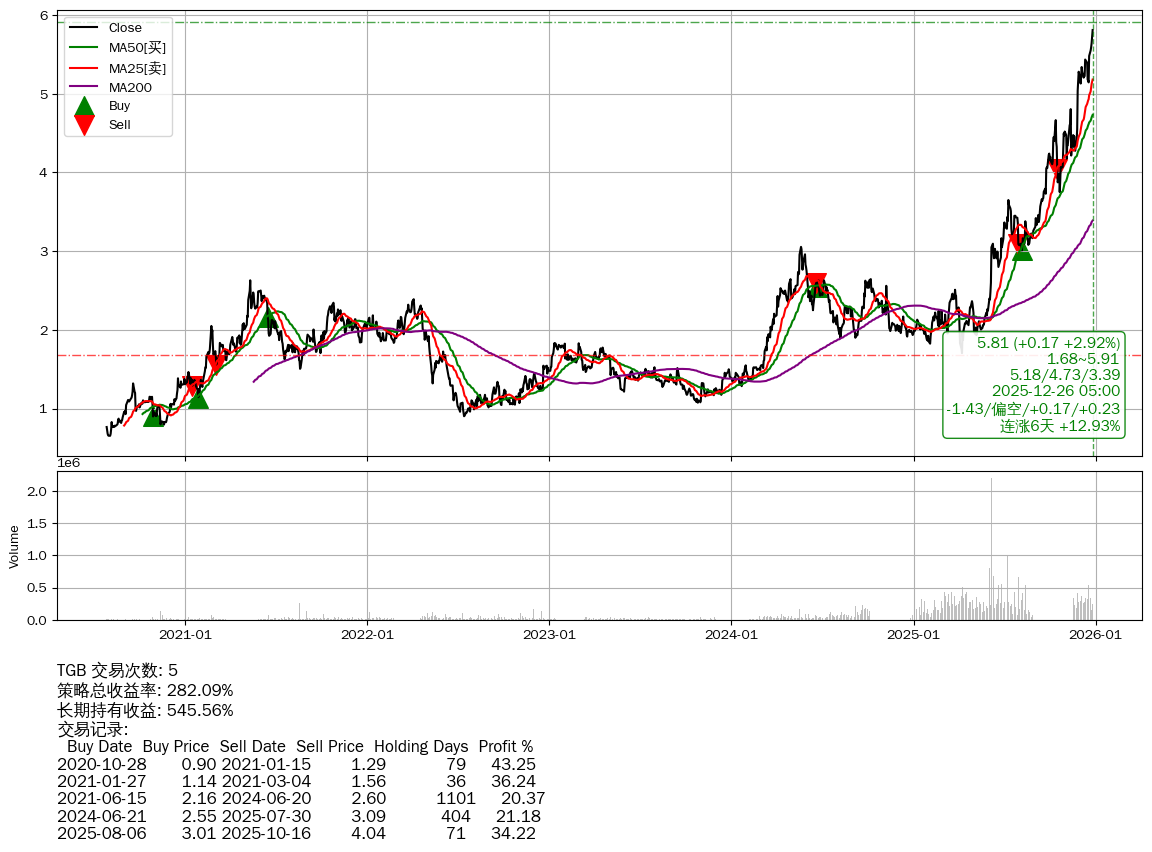 | 9 | TGB | $5.81(+0.17 +3.02%) 12-26 14:59 5.64 12-24 | 📈涨破 52周高点 (5.91) 📈连涨6天 +12.93% | +282.09% | +545.56% | -263.47% | 5 | 偏空/0.17/0.23 | 2020-07-27~2025-12-26 |