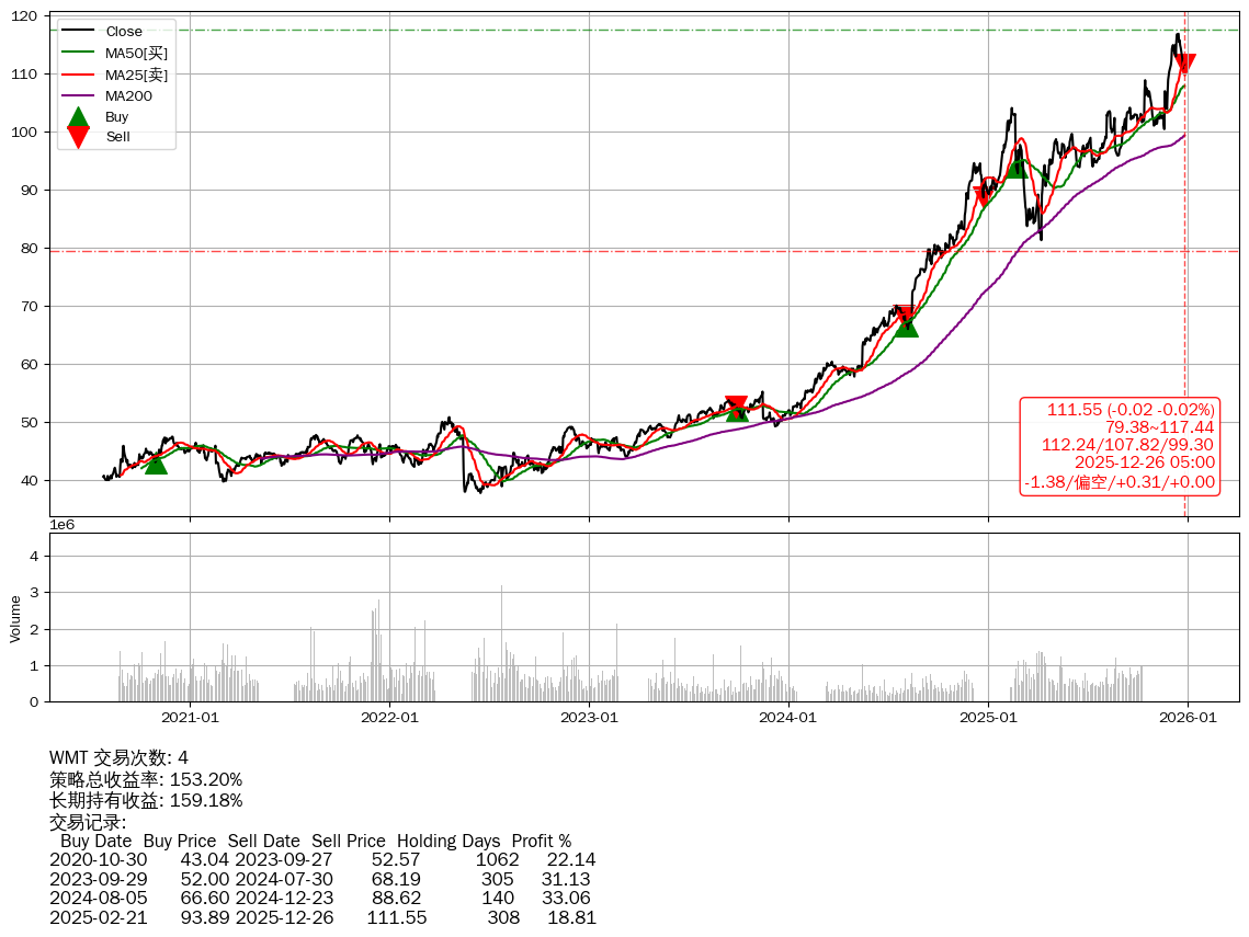 | 21 | ★WMT | $111.74(+0.17 +0.15%) 12-26 14:59 111.57 12-24 | 📉回撤 12-15 -4.50% (10天) 116.81(12-14)→110.86(12-22) | +153.20% | +159.18% | -5.98% | 4 | 偏空/0.31/0.00 | 2020-07-27~2025-12-26 |