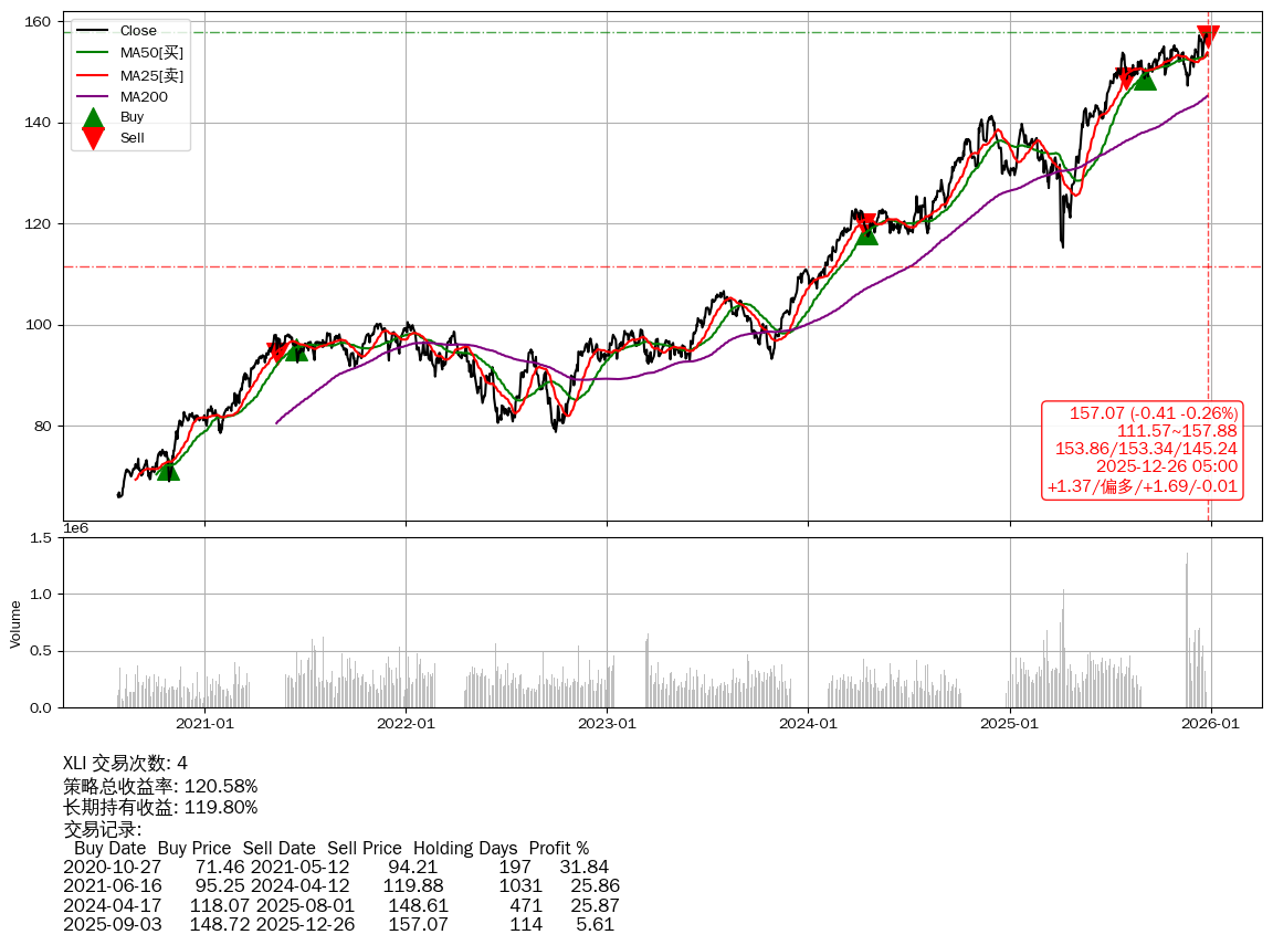| 27 | ★XLI | $157.21(-0.43 -0.27%) 12-26 14:59 157.65 12-24 | 📉回撤 12-25 -0.26% (0天) 157.48(12-23)→157.07(12-25) | +120.58% | +119.80% | +0.78% | 4 | 偏多/1.69/-0.01 | 2020-07-27~2025-12-26 |