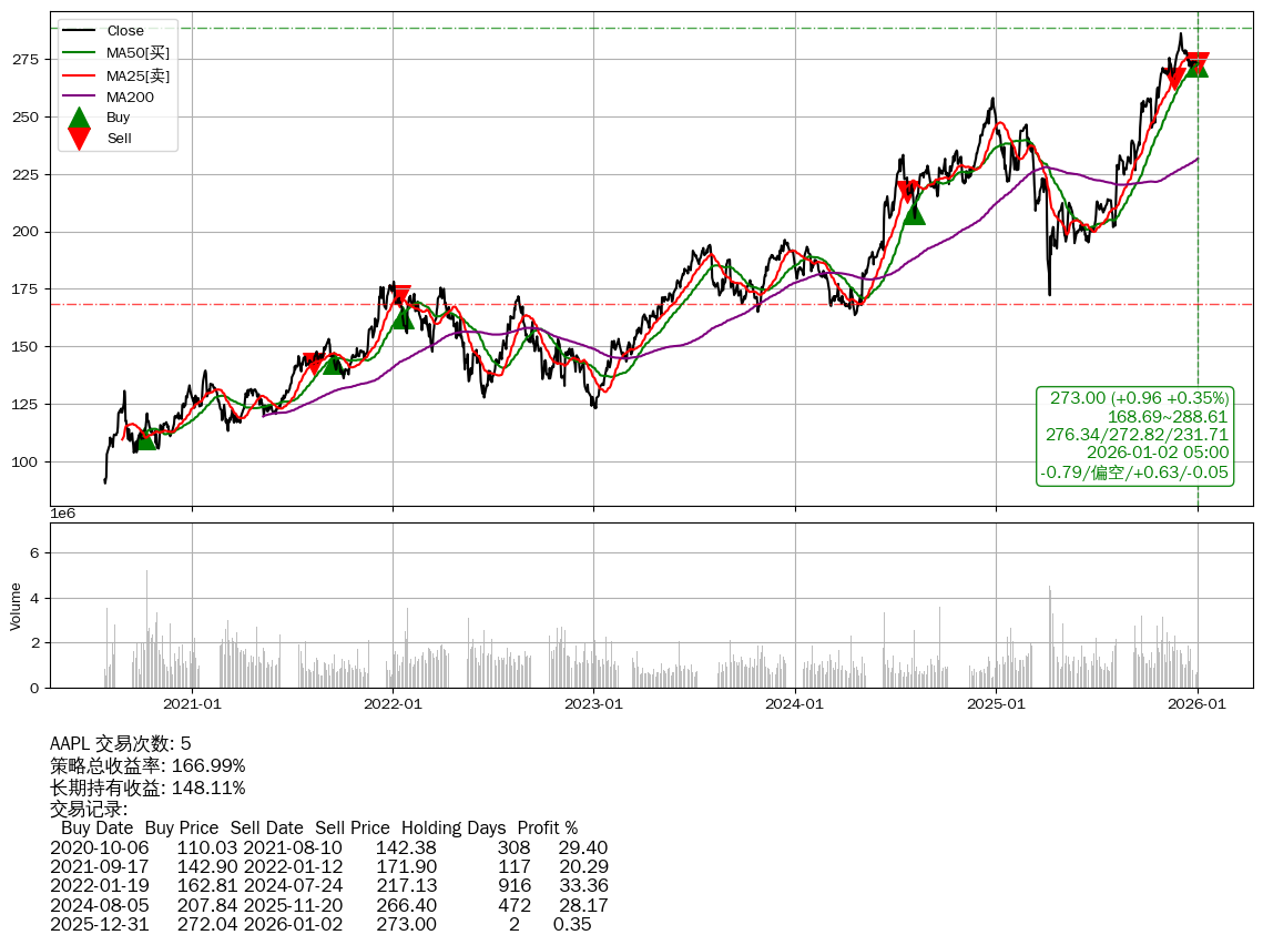 | 17 | ★AAPL | $270.98(-0.86 -0.32%) 01-02 14:59 271.84 12-31 | 📈涨破 MA10/50 均线 📉回撤 2025-12-02 -4.58% (30天) 286.09(2025-12-01)→270.82(2025-12-21) | +166.99% | +148.11% | +18.87% | 5 | 偏空/0.63/-0.05 | 2020-07-27~2026-01-02 |