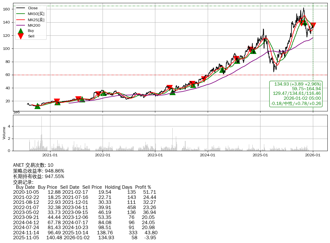 | 2 | ★ANET | $133.61(+2.62 +2.00%) 01-02 14:59 130.99 12-31 | 📈涨破 MA5/10/50 均线 📉回撤 2025-10-29 -16.71% (64天) 161.99(2025-10-28)→117.43(2025-11-20) | +948.86% | +947.55% | +1.30% | 10 | 中性/0.78/0.26 | 2020-07-27~2026-01-02 |