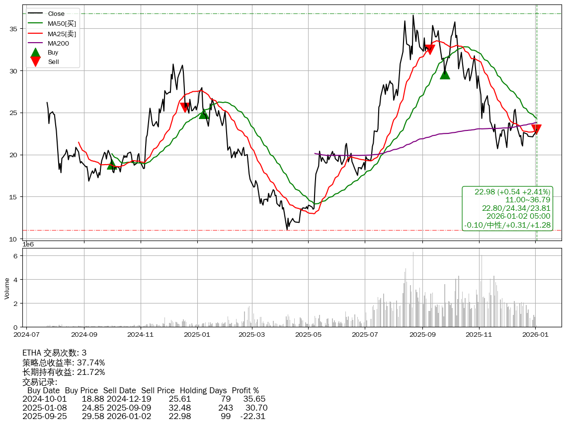 | 35 | ★ETHA | $23.57(+1.13 +5.04%) 01-02 14:59 22.44 12-31 | 📈涨破 MA25 均线 📉回撤 2025-08-24 -37.18% (130天) 36.58(2025-08-21)→20.70(2025-11-20) | +37.74% | +21.72% | +16.02% | 3 | 中性/0.31/1.28 | 2024-07-23~2026-01-02 |