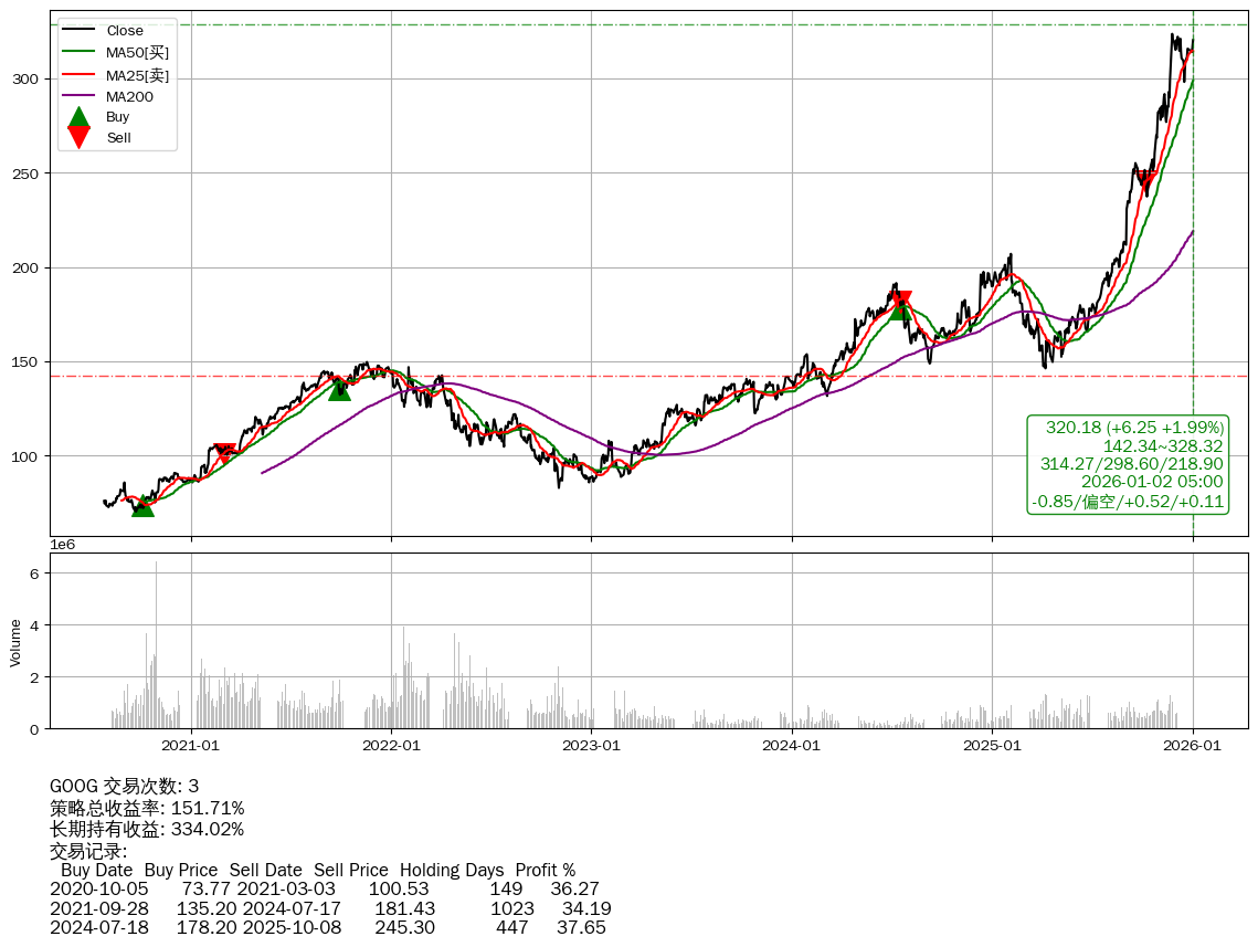 | 20 | ★GOOG | $315.32(+1.53 +0.49%) 01-02 14:59 313.79 12-31 | 📈涨破 MA5/25 均线 📉回撤 2025-11-25 -1.02% (37天) 323.47(2025-11-24)→298.01(2025-12-16) | +151.71% | +334.02% | -182.31% | 3 | 偏空/0.53/0.11 | 2020-07-27~2026-01-02 |