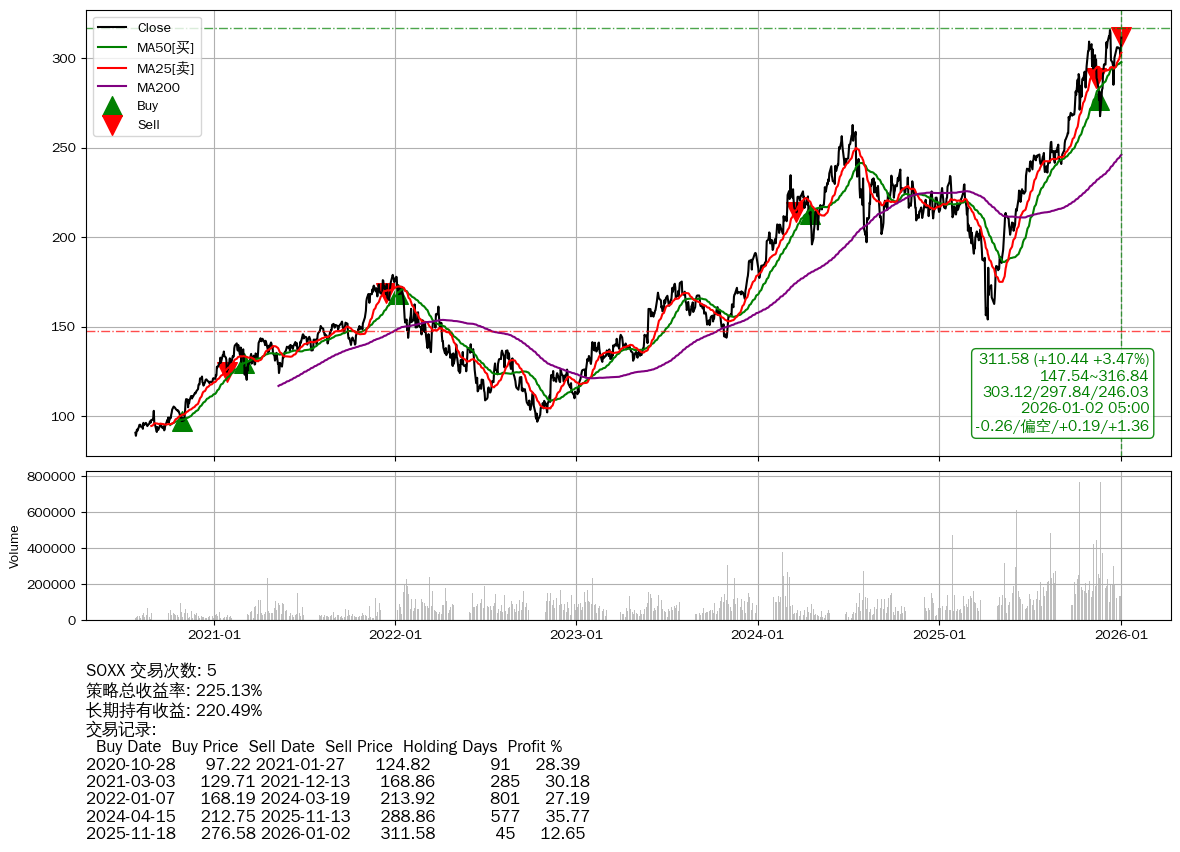 | 10 | ★SOXX | $313.85(+12.71 +4.22%) 01-02 14:59 301.14 12-31 | 📈涨破 MA5/10/25 均线 📉回撤 2025-12-10 -1.32% (22天) 315.75(2025-12-09)→285.14(2025-12-16) | +225.13% | +220.49% | +4.65% | 5 | 偏空/0.19/1.36 | 2020-07-27~2026-01-02 |