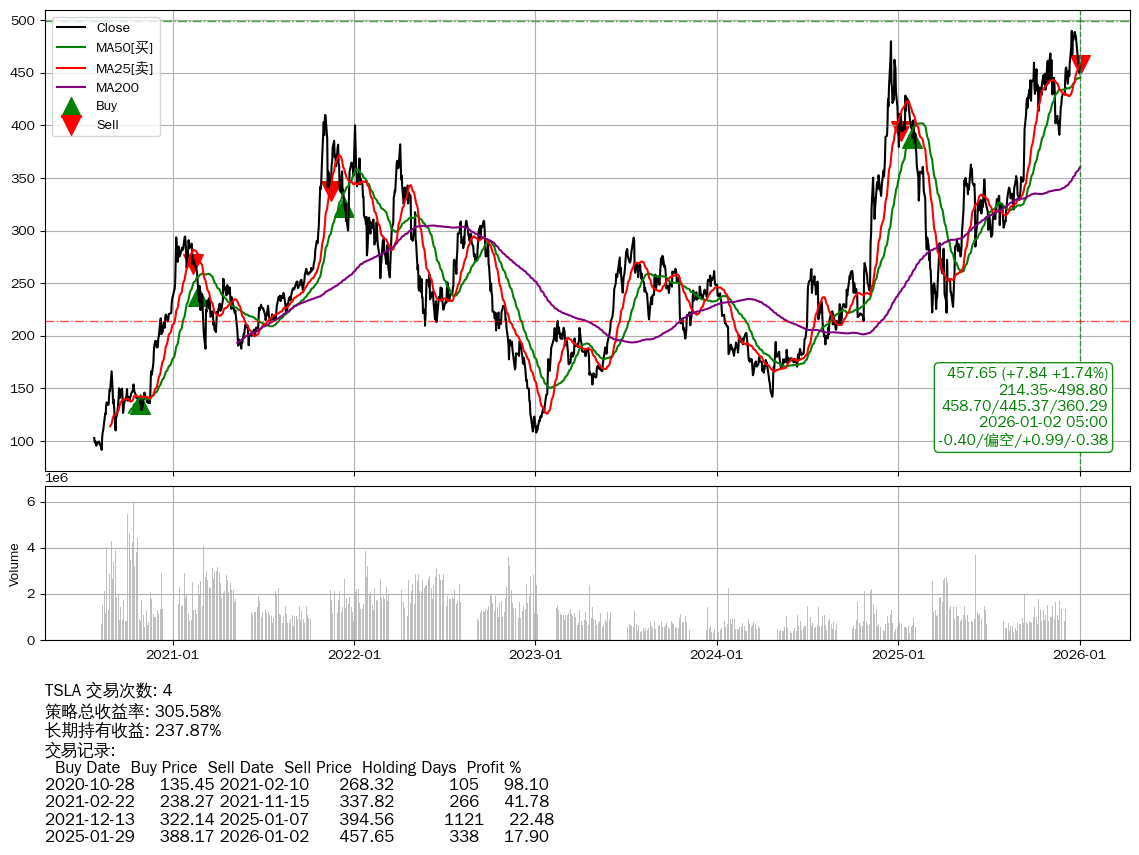 | 6 | ★TSLA | $438.10(-11.45 -2.55%) 01-02 14:59 449.55 12-31 | 📉回撤 2025-12-16 -6.56% (16天) 489.79(2025-12-15)→449.81(2025-12-30) | +305.58% | +237.87% | +67.71% | 4 | 偏空/0.99/-0.38 | 2020-07-27~2026-01-02 |