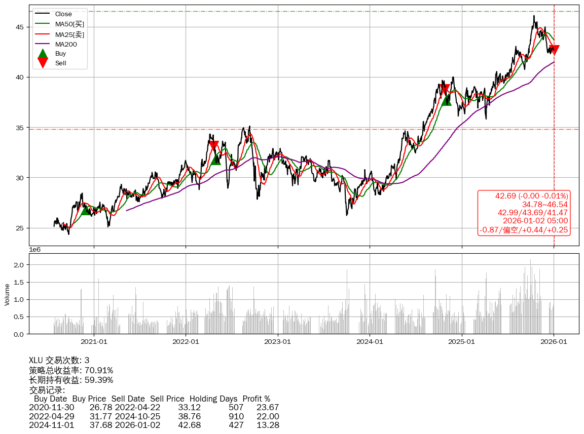 | 29 | ★XLU | $43.19(+0.50 +1.17%) 01-02 14:59 42.69 12-31 | 📉回撤 2025-10-15 -7.41% (78天) 46.10(2025-10-14)→42.30(2025-12-18) | +70.91% | +59.39% | +11.52% | 3 | 偏空/0.44/0.25 | 2020-07-27~2026-01-02 |