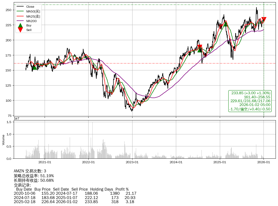 | 32 | ★AMZN | $226.50(-4.34 -1.88%) 01-02 14:59 230.84 12-31 | 📈涨破 MA5/10/50 均线 📉回撤 2025-11-03 -7.93% (59天) 253.99(2025-11-02)→217.19(2025-11-19) | +51.19% | +50.68% | +0.51% | 3 | 偏空/0.4/-0.50 | 2020-07-27~2026-01-02 |