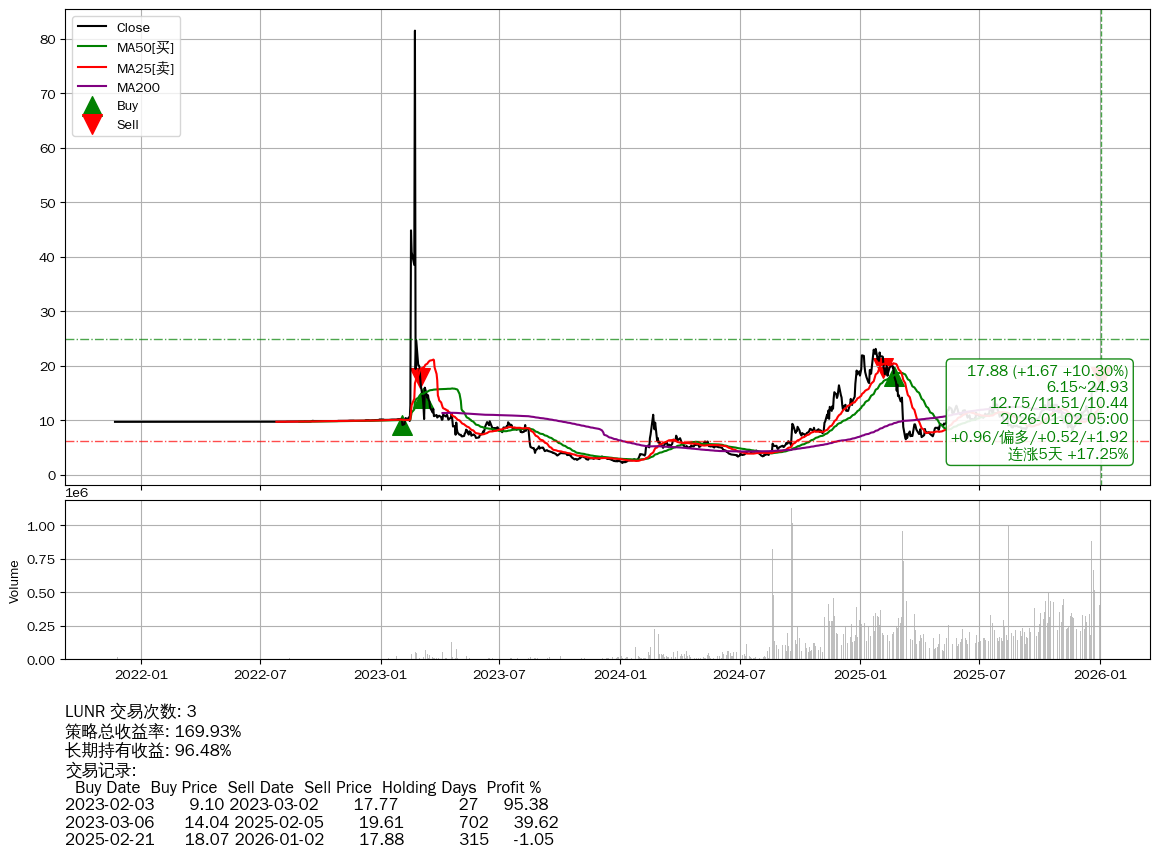 | 14 | LUNR | $17.87(+1.65 +10.17%) 01-02 14:59 16.22 12-31 | 📈连涨5天 +17.25% 📉回撤 2023-02-22 -78.05% (1044天) 81.47(2023-02-21)→2.11(2024-01-03) | +169.93% | +96.48% | +73.44% | 3 | 偏多/0.52/1.92 | 2021-11-22~2026-01-02 |