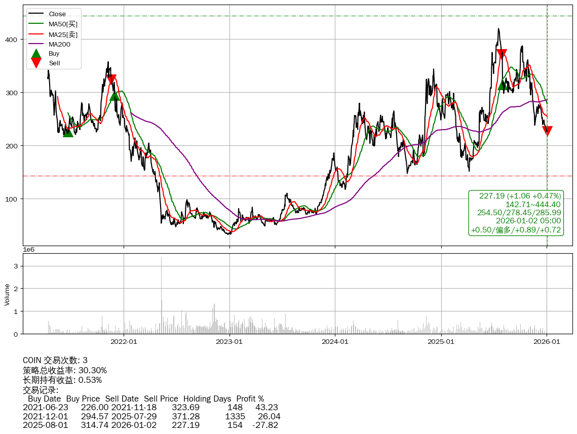 | 36 | ★COIN | $236.53(+10.40 +4.60%) 01-02 14:59 226.13 12-31 | 📉回撤 2025-07-20 -45.90% (165天) 419.98(2025-07-17)→226.13(2025-12-30) | +30.30% | +0.53% | +29.78% | 3 | 偏多/0.89/0.72 | 2021-04-14~2026-01-02 |