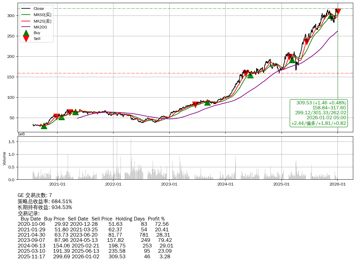| 4 | ★GE | $320.75(+12.71 +4.13%) 01-02 14:59 308.04 12-31 | 📉回撤 2025-12-25 -2.19% (7天) 316.46(2025-12-23)→308.06(2025-12-30) | +684.51% | +934.53% | -250.02% | 7 | 偏多/1.81/0.82 | 2020-07-27~2026-01-02 |