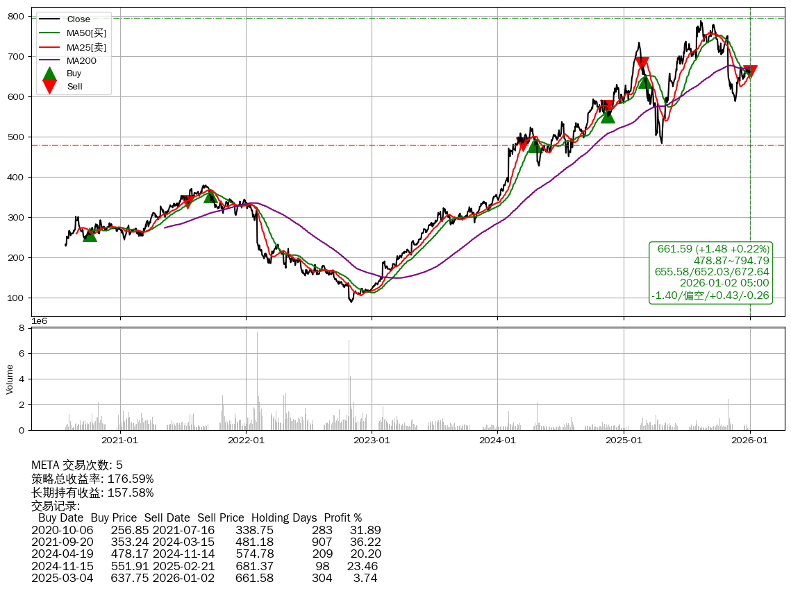 | 13 | ★META | $650.74(-9.16 -1.39%) 01-02 14:59 659.90 12-31 | 📉回撤 2025-08-12 -16.11% (142天) 788.62(2025-08-11)→588.67(2025-11-19) | +176.59% | +157.58% | +19.01% | 5 | 偏空/0.43/-0.26 | 2020-07-27~2026-01-02 |