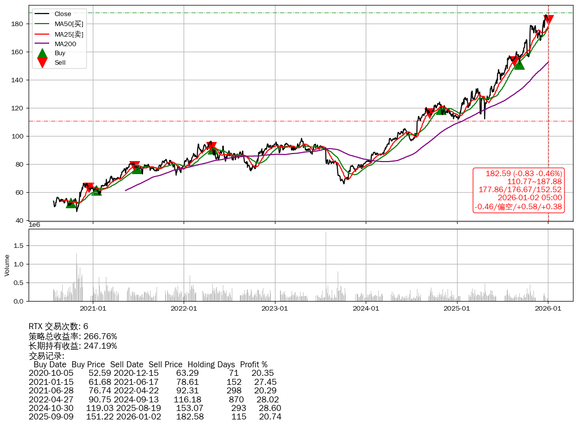 | 8 | ★RTX | $187.25(+3.80 +2.07%) 01-02 14:59 183.45 12-31 | 📉回撤 2025-12-25 -2.03% (7天) 186.36(2025-12-23)→182.59(01-01) | +266.76% | +247.19% | +19.58% | 6 | 偏空/0.58/0.38 | 2020-07-27~2026-01-02 |