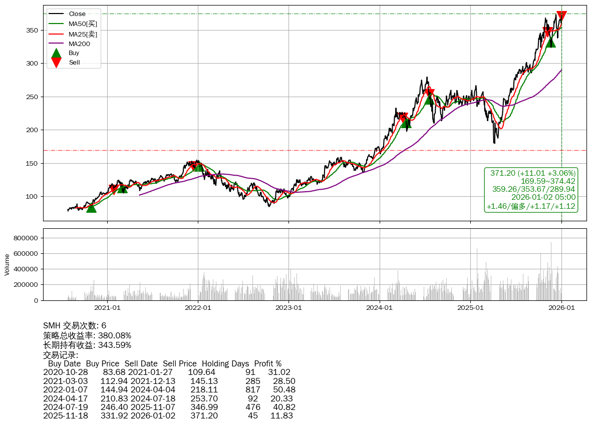 | 5 | ★SMH | $373.34(+13.26 +3.68%) 01-02 14:59 360.08 12-31 | 📈涨破 MA5/10 均线 📉回撤 2025-12-10 -0.49% (22天) 373.03(2025-12-09)→338.00(2025-12-16) | +380.08% | +343.59% | +36.49% | 6 | 偏多/1.17/1.12 | 2020-07-27~2026-01-02 |