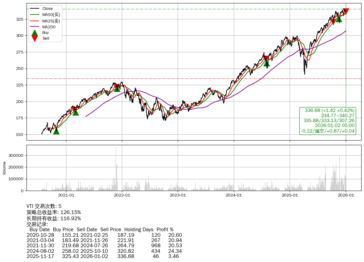 | 22 | ★VTI | $336.36(+1.10 +0.33%) 01-02 14:59 335.26 12-31 | 📈涨破 MA25 均线 📉回撤 2025-12-25 -0.93% (7天) 339.84(2025-12-23)→335.26(2025-12-30) | +126.15% | +116.92% | +9.23% | 5 | 偏空/0.87/0.04 | 2020-07-27~2026-01-02 |