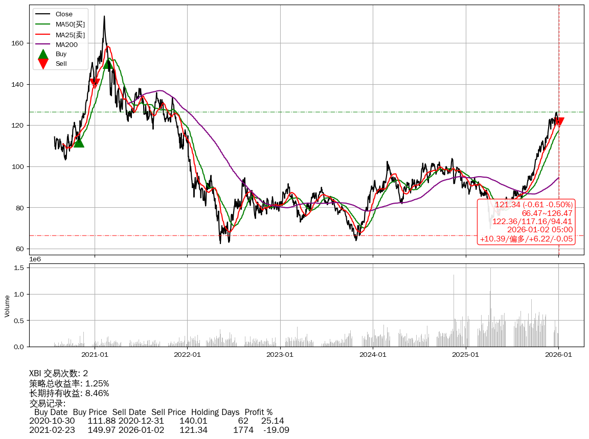 | 37 | ★XBI | $121.51(-0.45 -0.37%) 01-02 14:59 121.96 12-31 | 📉回撤 2021-02-08 -29.87% (1788天) 173.03(2021-02-07)→62.39(2022-05-10) | +1.25% | +8.46% | -7.20% | 2 | 偏多/6.22/-0.05 | 2020-07-27~2026-01-02 |
