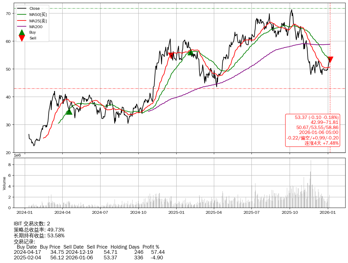 | 34 | ★IBIT | $52.48(-0.99 -1.85%) 01-06 14:56 53.47 01-05 | 📈连涨4天 +7.48% 📉回撤 2025-10-06 -25.14% (91天) 71.29(2025-10-05)→47.98(2025-11-20) | +49.73% | +53.58% | -3.86% | 2 | 偏空/0.99/-0.20 | 2024-01-11~2026-01-06 |