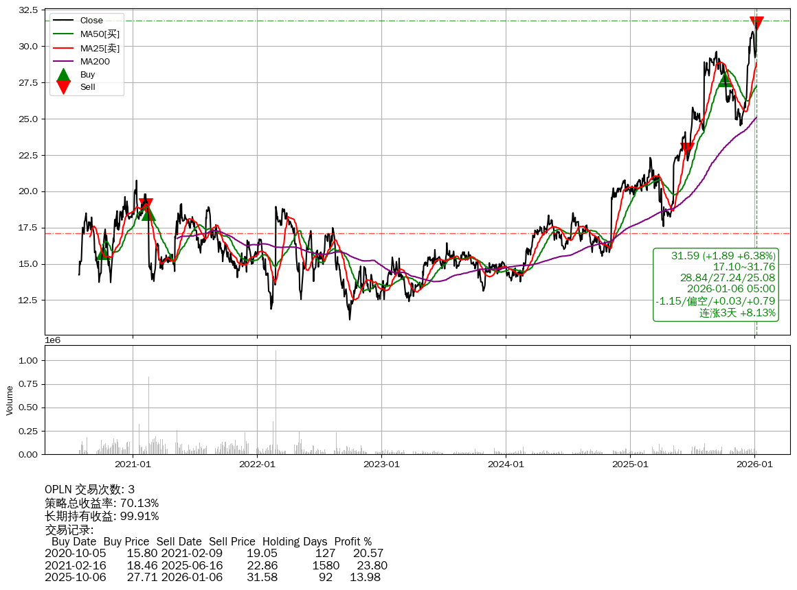 | 30 | 🟢OPLN | $31.57(+1.86 +6.26%) 01-06 14:59 29.70 01-05 | 📈涨破 MA5/10 均线 📈涨破 52周高点 (31.76) 📈连涨3天 +8.13% | +70.13% | +99.91% | -29.77% | 3 | 偏空/0.03/0.79 | 2020-07-27~2026-01-06 |
