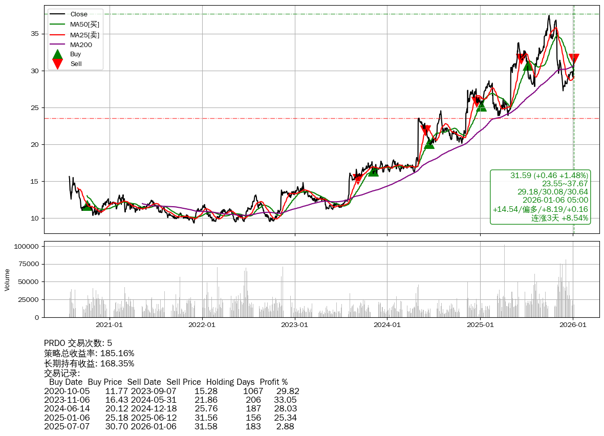 | 13 | PRDO | $31.53(+0.35 +1.12%) 01-06 14:56 31.18 01-05 | 📈连涨3天 +8.54% 📉回撤 2025-09-30 -15.71% (97天) 37.47(2025-09-29)→27.25(2025-11-23) | +185.16% | +168.35% | +16.81% | 5 | 偏多/8.19/0.16 | 2020-07-27~2026-01-06 |