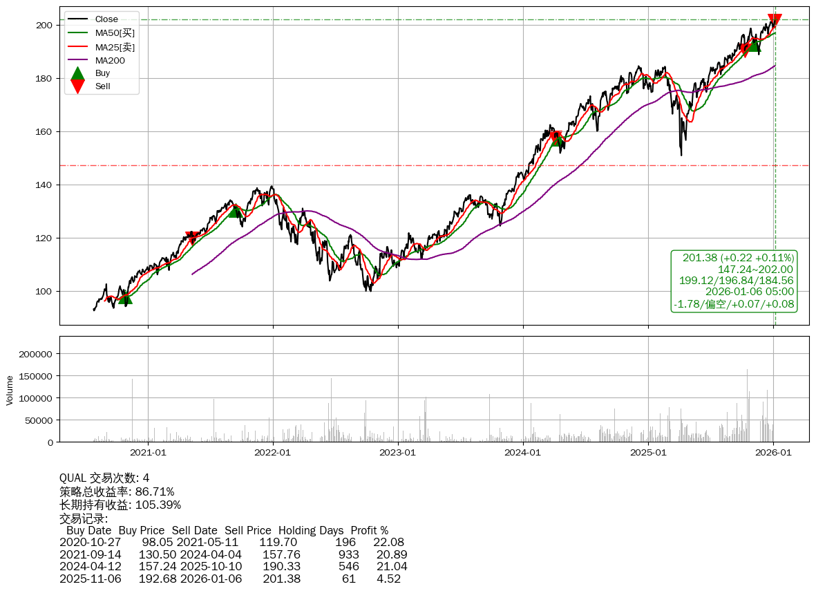 | 26 | ★QUAL | $202.99(+1.82 +0.90%) 01-06 14:56 201.17 01-05 | +86.71% | +105.39% | -18.68% | 4 | 偏空/0.07/0.08 | 2020-07-27~2026-01-06 | |